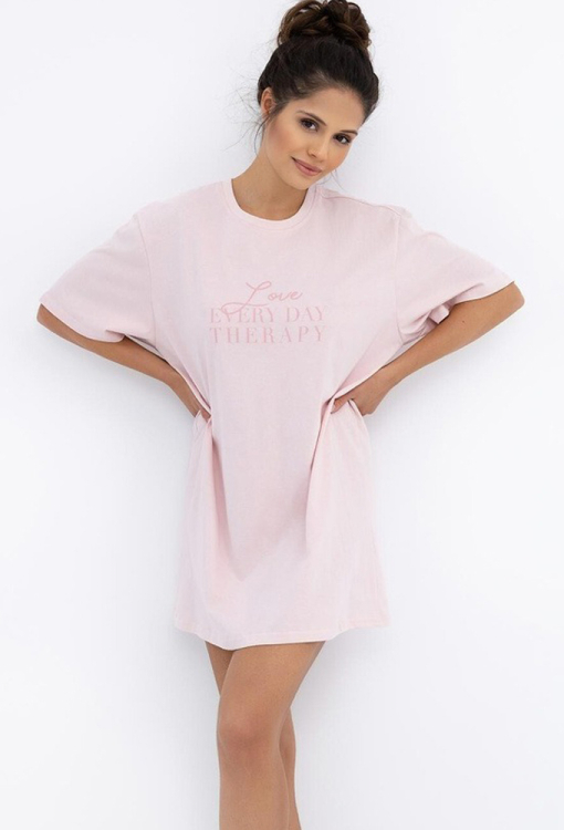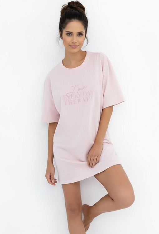 Зручна нічна сорочка футболка Annabelle від польського бренду Sensis. Сорочка виконана з якісної та м'якої бавовни пудрового кольору, вільного oversise силуету та довжиною вище колін. Модель із широкими короткими рукавами та круглим вирізом горла, попереду прикрашена стильним принтом із напису. Нічна сорочка красива і дуже комфортна, полюбиться з першого разу, також може бути корисним подарунком коханій або близькій людині.