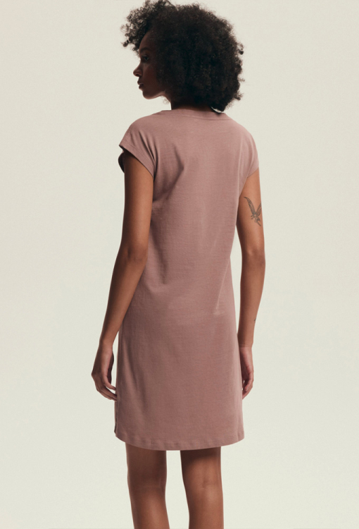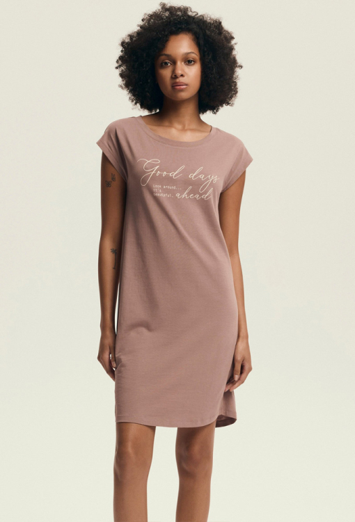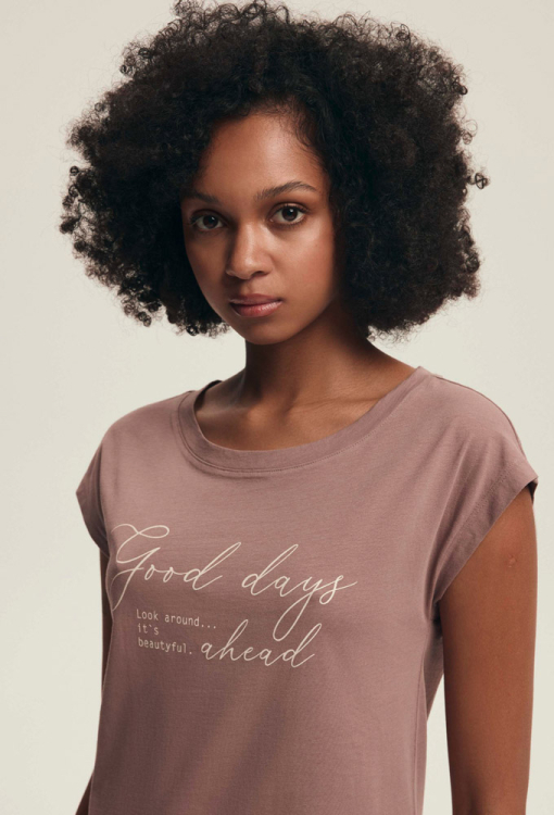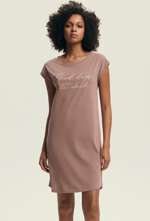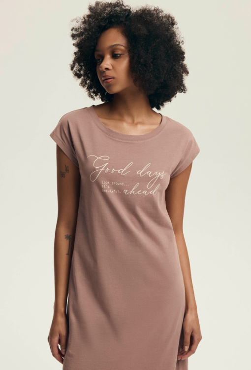 Легка та комфортна нічна сорочка Delanie від польського бренду Henderson Ladies. Сорочка виконана з якісної та м'якої бавовни рожевого кольору, прямого силуету, з короткими рукавами та круглим вирізом горла. Модель довжиною вище колін і з закругленими внизу полицями, на рівні грудей прикрашена принтом у вигляді напису "Good days ahead". Нічна сорочка стильна і дуже комфортна, ідеальна для сну і домашнього відпочинку, а також може бути відмінним подарунком коханій або близькій людині.