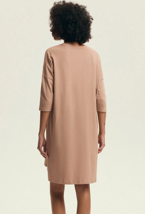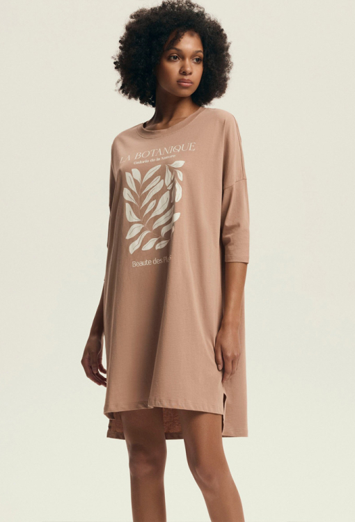 Стильна нічна сорочка Dextra від польського бренду Henderson Ladies. Сорочка виконана з якісної та м'якої бавовни персикового кольору, вільного силуету та довжиною вище колін. Модель з рукавами 3/4 та круглим вирізом горла внизу з боків оброблена невеликими розрізами, спинка злегка подовжена. Передня полиця виробу прикрашена принтом у вигляді гілок із листям та написом "la botanique" у білому кольорі. Нічна сорочка красива й дуже комфортна, ідеальна для сну і домашнього відпочинку, а також може бути відмінним подарунком коханій або близькій людині.