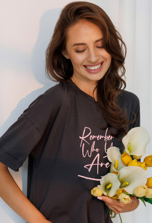 Стильна нічна сорочка з колекції Don't Worry від українського бренду Roksana. Сорочка виконана з м'якої та якісної бавовни графітового кольору, вільного силуету та довжиною вище колін. Модель із короткими рукавами та круглим вирізом горла, спереду по центру прикрашена принтом у вигляді напису рожевого відтінку. Нічна сорочка дуже гарна і комфортна, ідеальний варіант для сну і створення затишного домашнього образу, також може бути чудовим подарунком коханій або близькій людині.