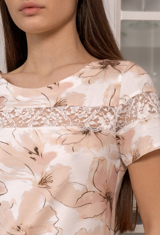 Класична нічна сорочка з колекції Donna від українського бренду Roksana. Сорочка виконана з м'якої та якісної бавовни кремового кольору з принтом у вигляді великих бежевих квітів, прямого силуету та довжиною трохи вище колін. Модель з короткими рукавами та круглим вирізом горла, вгорі та на рукавах прикрашена вставками з ажурного мережива. Нічна сорочка дуже гарна і комфортна, ідеальний варіант для сну і створення затишного домашнього образу, також може бути чудовим подарунком коханій або близькій людині.