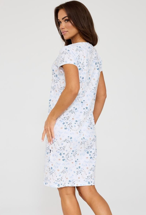 Класична жіноча нічна сорочка Florence від польського бренду Cornette. Сорочка виконана з якісної та м'якої бавовни, білого кольору з ніжним квітковим принтом блакитного кольору, прямого крою та довжиною трохи вище колін. Модель з короткими рукавами та круглим вирізом горла, внизу з боків оброблена розрізами. Нічна сорочка дуже гарна і комфортна, упакована в картонну коробку підійде як подарунок коханій або близькій людині.