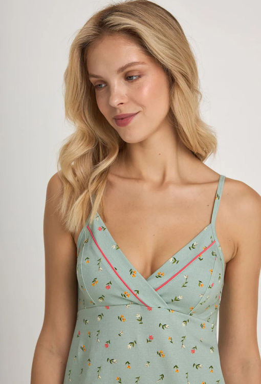 Витончена нічна сорочка з колекції Green Meadow від українського бренду Ellen. Сорочка виконана з якісної та м'якої бавовни, зеленого кольору в дрібний квітковий принт рожевого та оранжевого кольору, на тонких бретелях, що регулюються, й довжиною вище колін. Модель напівприлеглого силуету, з V-подібним декольте та підрізом під грудьми, прикрашена тонким рожевим кантом по лінії вирізу. Нічна сорочка дуже гарна і комфортна, ідеальна для сну в будь-який час року, також підійде в якості подарунка коханій та близькій людині.