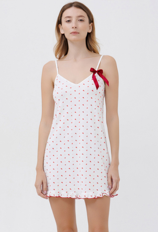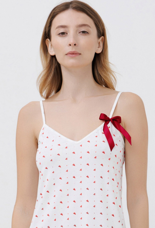 Літня нічна сорочка з колекції Heart від українського бренду Roksana. Сорочка виконана з м'якої та якісної бавовни, білого кольору з принтом у вигляді дрібних червоних сердець, напівприлеглого силуету та довжиною вище колін. Модель з тонкими регульованими бретелями і V-подібним декольте, вгорі прикрашена червоним бантом, внизу оброблена рюшем з червоною обробкою. Нічна сорочка дуже гарна і комфортна, ідеальний варіант для сну і створення чарівного домашнього образу, також може бути чудовим подарунком коханій або близькій людині.