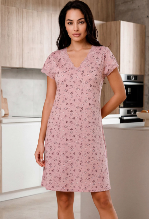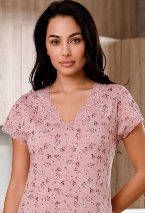Класична нічна сорочка з колекції Lila від українського бренду Roksana. Сорочка виконана з м'якої та якісної бавовни, рожевого кольору в темно-рожевий з білим квітковий принт, напівприлеглого силуету та довжиною вище колін. Модель з короткими рукавами та V-подібним декольте, по лінії вирізу та на рукавах прикрашена вставками з ажурного мережива. Нічна сорочка дуже гарна і комфортна, ідеальна для сну в будь-який час року, а також підійде в якості подарунка коханій і близькій людині.