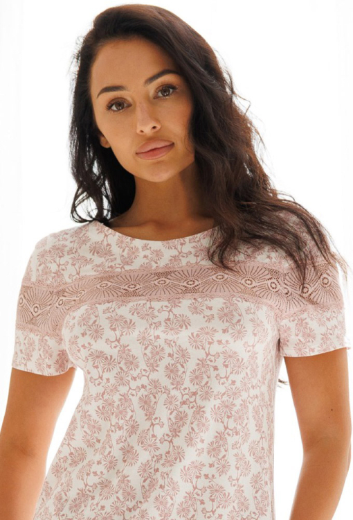 Класична нічна сорочка з колекції Lila від українського бренду Roksana. Сорочка виконана з м'якої та якісної бавовни, білого кольору в темно-рожевий квітковий принт, прямого силуету і завдовжки трохи вище колін. Модель з короткими рукавами та круглим вирізом горла, вгорі та на рукавах прикрашена вставками з ажурного мережива. Нічна сорочка дуже гарна і комфортна, ідеальна для сну в будь-який час року, а також підійде як подарунок коханій і близькій людині.