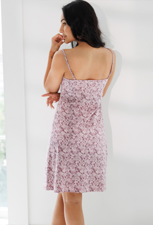 Легка та ніжна нічна сорочка з колекції Lila від українського бренду Roksana. Сорочка виконана з м'якої та якісної бавовни, рожевого кольору в темно-рожевий квітковий принт, напівприлеглого силуету та довжиною вище колін. Модель на тонких регульованих бретелях і з широким декольте, на грудях оброблена оригінальним драпіруванням. Нічна сорочка дуже гарна і комфортна, ідеальна для сну в будь-який час року, а також підійде як подарунок коханій і близькій людині.