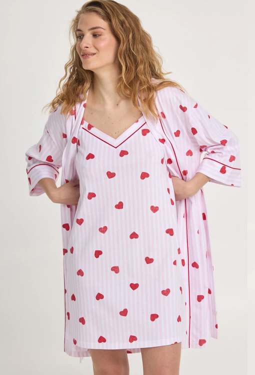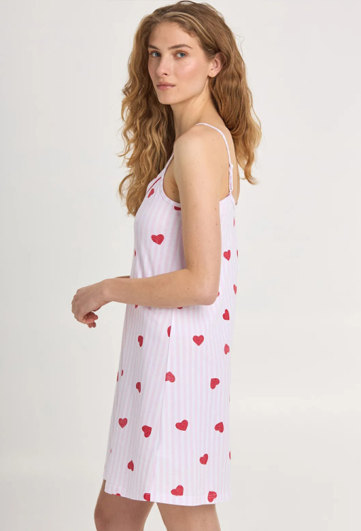 Ніжна романтична нічна сорочка з колекції Loveu від українського бренду Ellen. Сорочка виконана з якісної та м'якої бавовни, рожевого кольору в білу смужку та принт з червоних сердець, прямого силуету та довжиною вище колін. Модель із тонкими регульованими бретелями та V-подібним декольте, по лінії вирізу прикрашена тонким кантом червоного кольору. Виріб має чудову повітропроникність і не сковує рухів під час сну. Нічна сорочка дуже гарна та зручна, також може бути прекрасним одягом для дому або корисним подарунком коханій і близькій людині.