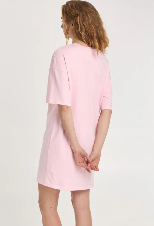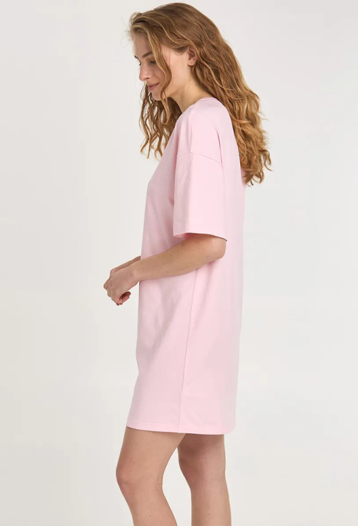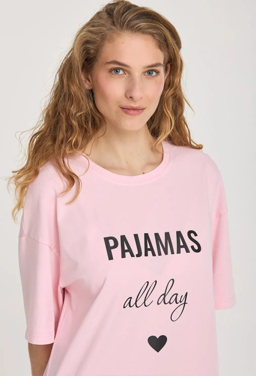 Стильна нічна сорочка з колекції Flirty від українського бренду Ellen. Сорочка виконана з якісної та м'якої бавовни рожевого кольору, прямого силуету та довжиною вище колін. Модель з короткими рукавами та круглим вирізом горла, спереду прикрашена принтом з напису "Pajamas all day" та серця чорного кольору. Виріб має чудову повітропроникність і не сковує рухів під час сну. Нічна сорочка дуже гарна і комфортна, також може бути прекрасним одягом для дому або корисним подарунком коханій і близькій людині.