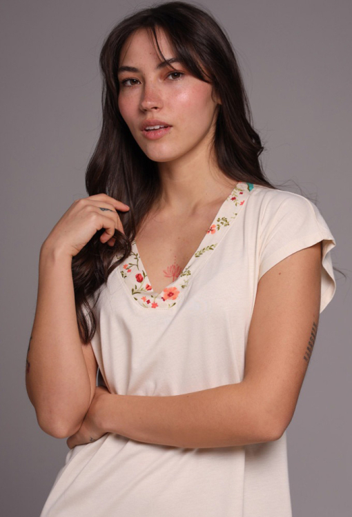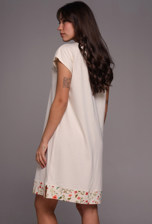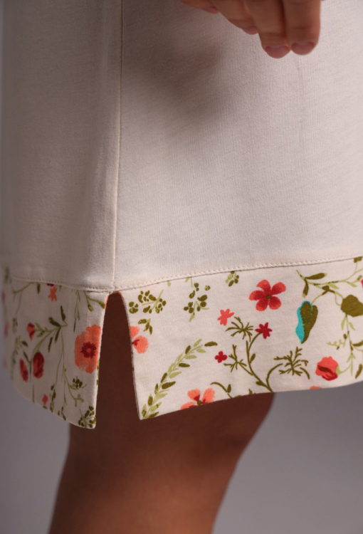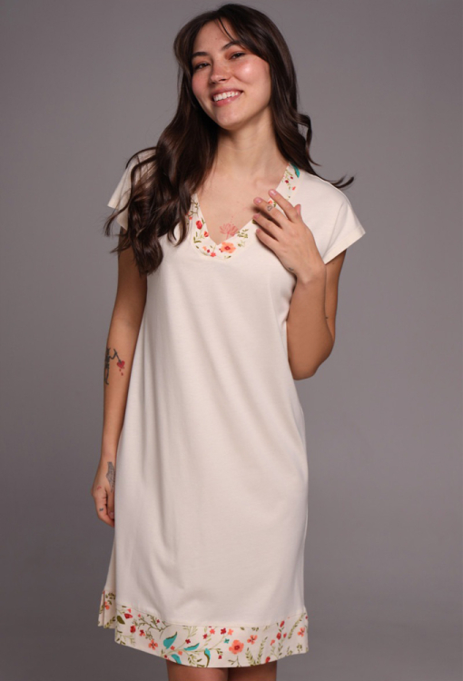 Комфортна нічна сорочка Прованс від українського бренду German Volf. Сорочка виконана з якісної та м'якої бавовни молочного кольору, вільного силуету і довжиною трохи вище колін. Модель з короткими рукавами, V-подібним вирізом горла та невеликими бічними розрізами, по лінії вирізу та внизу прикрашена вставками із яскравої тканини з квітковим принтом. Нічна сорочка дуже гарна і приємна до тіла, ідеальна як для сну, так і для лінивих ранкових годин, а також може бути корисним подарунком для близьких людей.