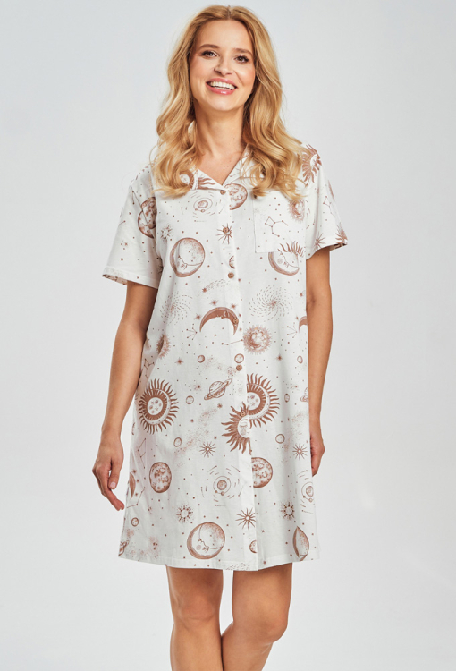 Зручна нічна сорочка Sol від польського бренду Taro. Сорочка виконана з якісної та м'якої бавовни, білого кольору з бежевим принтом на космічну тематику, прямого силуету та довжиною вище колін. Модель із короткими рукавами та відкладним коміром, застібається на ґудзики. Сорочка дуже красива та приємна до тіла, підійде як для сну, так і для стильного домашнього образу, а також може бути корисним подарунком для близьких людей.