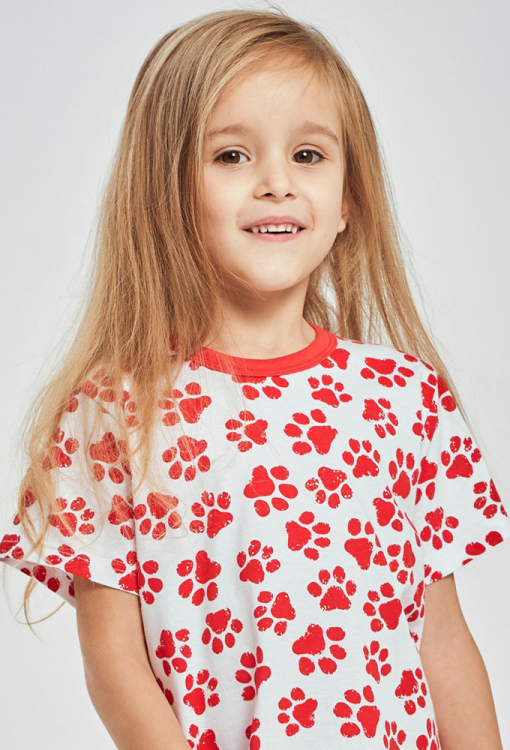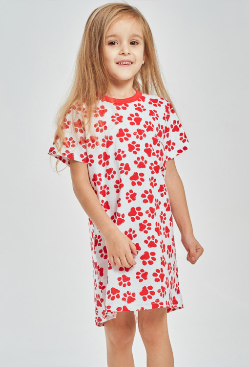 Яскрава дитяча нічна сорочка Nala від польського бренду Taro. Сорочка виконана з м'якої та якісної бавовни, кремового кольору з принтом у вигляді червоних слідів кошеня, вільного крою та довжиною вище колін. Модель з круглим вирізом горла та короткими рукавами, по лінії вирізу оброблена однотонним кантом червоного кольору. Нічна сорочка дуже гарна і комфортна, ідеально підходить для теплих ночей і вечорів, також буде чудовим подарунком для коханої дитини.