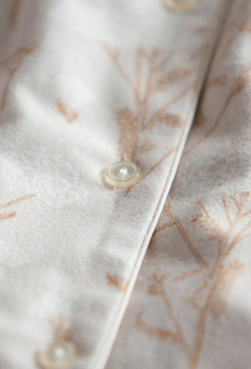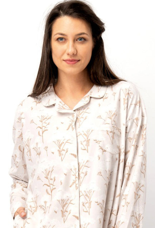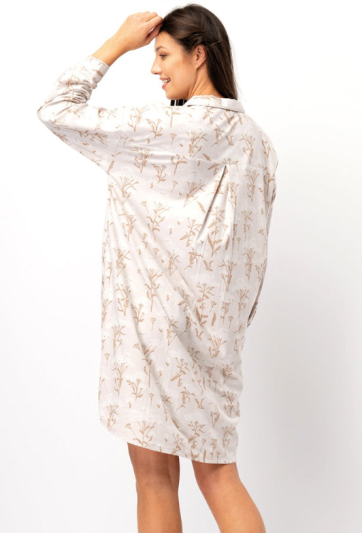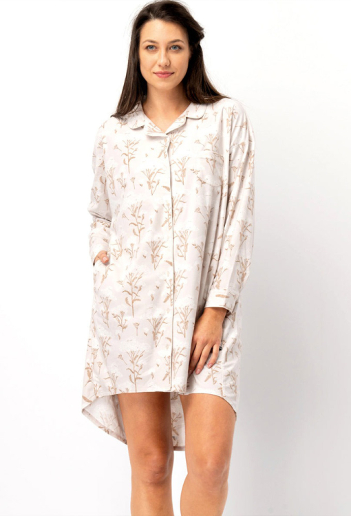 Зручна тепла нічна сорочка від польського бренду Key. Сорочка виконана з якісної та м'якої поліестерової фланелі, світло-бежевого кольору в коричневий принт у вигляді деревію, вільного силуету та довжиною вище колін. Модель з довгими рукавами на манжетах з застібкою, приспущеною лінією плеча, коміром і зручними бічними кишенями, застібається на ґудзики. На грудях зліва виробу розташована маленька кишенька, комір, полиці та кишеня прикрашені тонким кантом. Злегка подовжена спинка оброблена кокеткою та поздовжньою зустрічною складкою. Сорочка красива і дуже комфортна, зігріє холодними ночами, вранці та довгими зимовими вечорами вдома, а також може бути корисним подарунком коханій та близькій людині.
