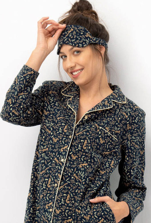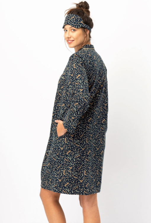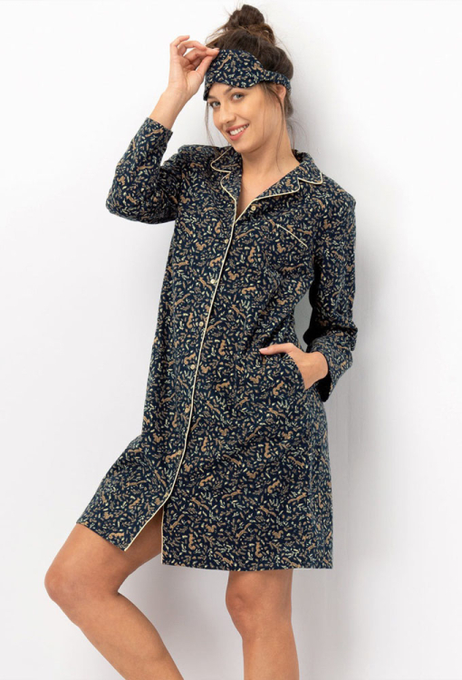 Осіння тепла нічна сорочка від польського бренду Key. Сорочка виконана з якісної та м'якої фланелі, графітового кольору у бежевий принт у вигляді білок і листя, прямого силуету та довжиною вище колін. Модель з довгими рукавами, відкладним коміром і зручними кишенями, застібається на ґудзики. На грудях ліворуч виріб прикрашений маленькою накладною кишенькою, комір, полиці та кишеня оброблені тонким кантом бежевого кольору. Сорочка красива і дуже комфортна, зігріє холодними ночами, вранці та довгими зимовими вечорами будинку, а також може бути корисним подарунком коханій та близькій людині.