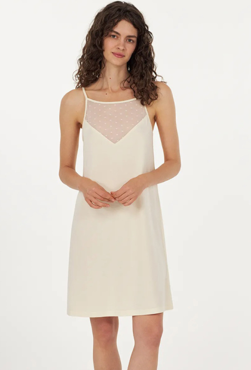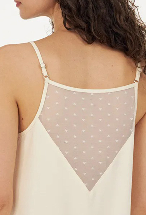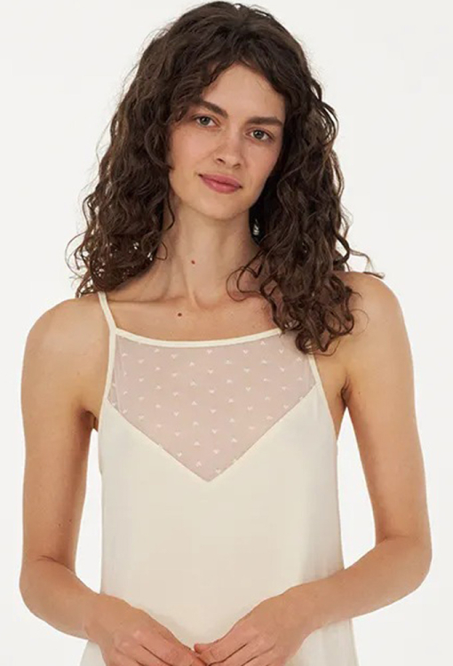 Витончена нічна сорочка з колекції Cecilia Creamy від українського бренду Ellen. Сорочка виконана з якісного та м'якого модалу кремового кольору, напівприлеглого силуету та довжиною вище колін. Модель з тонкими регульованими бретелями та квадратним вирізом горла, спереду та на спинці прикрашена трикутними вставками із сітки з візерунком у вигляді дрібних сердець. Нічна сорочка дуже гарна і комфортна, ідеально підходить для спокійного сну і затишних домашніх вечорів, а також може бути чудовим подарунком коханій або близькій людині.