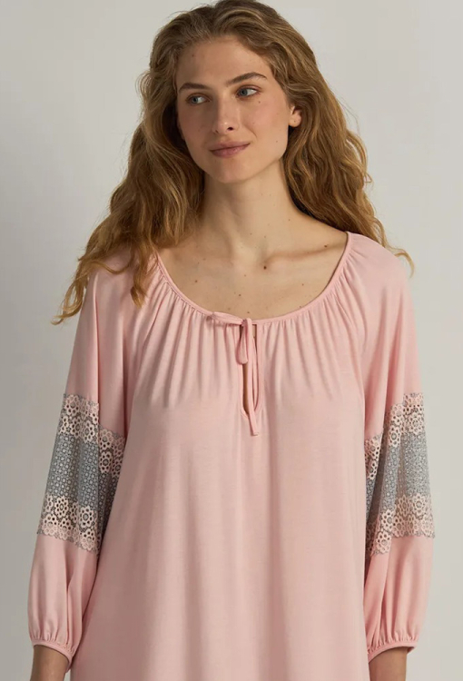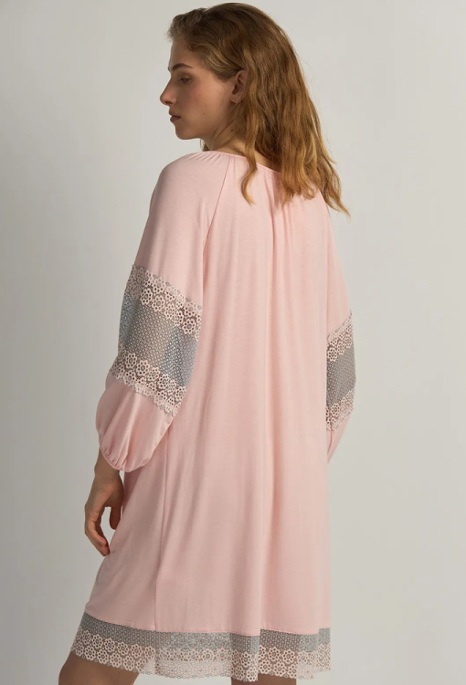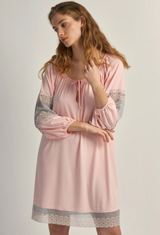 Чарівна нічна сорочка з колекції Katherine від українського бренду Ellen. Сорочка виконана з якісного та м'якого сумішевого модалу рожевого кольору, вільного силуету та довжиною вище колін. Модель із рукавами 7/8 та круглим вирізом горла, вгорі доповнена розрізом крапля на зав'язці. Горловина та рукави оброблені кантом та м'якими складками, рукави та низ прикрашені широкими вставками з ажурного мережива сірого кольору. Нічна сорочка дуже зручна і приємна до тіла, ідеальна для сну і домашнього відпочинку, також може бути корисним подарунком коханій або близькій людині.