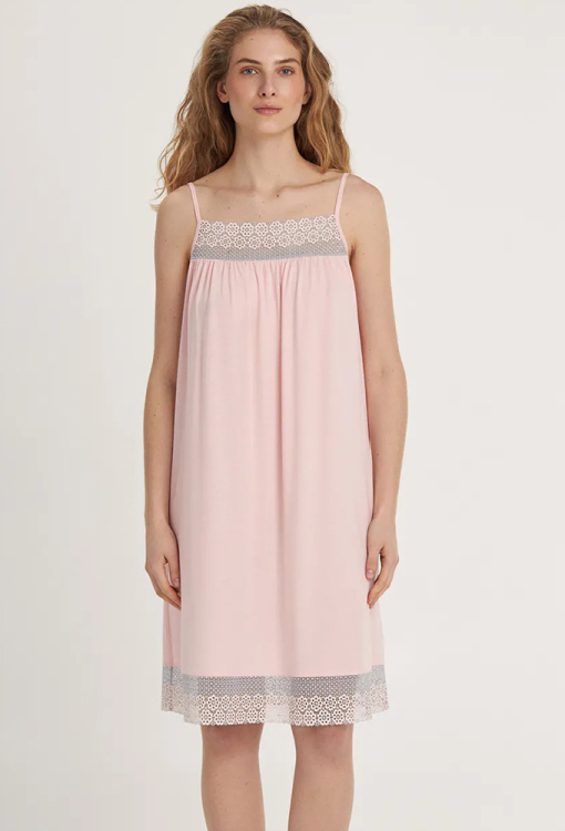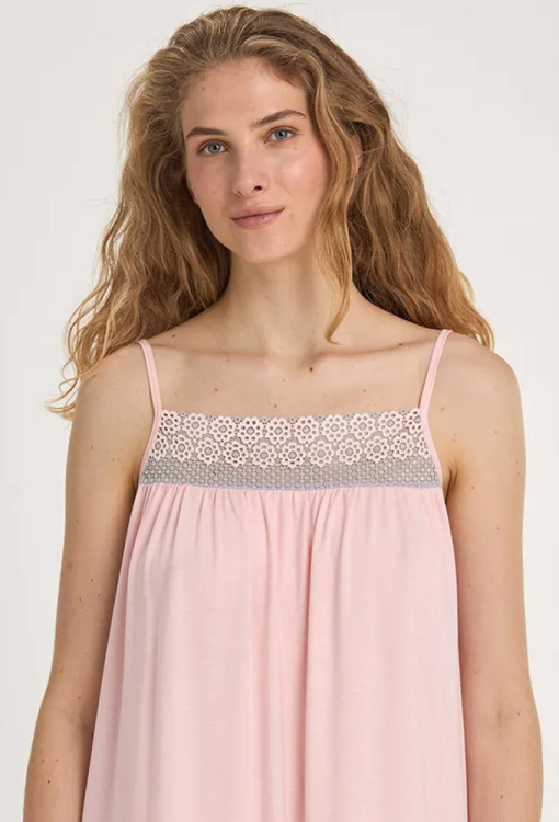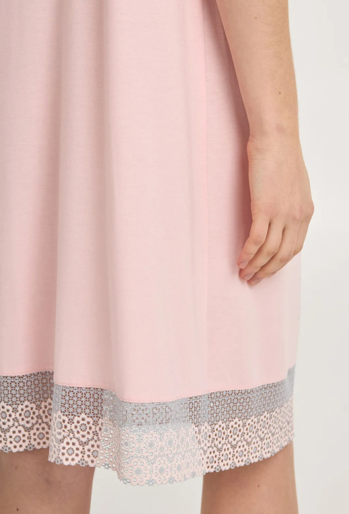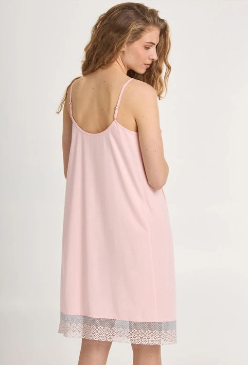 Чарівна нічна сорочка з колекції Katherine від українського бренду Ellen. Сорочка виконана з якісного та м'якого сумішевого модалу рожевого кольору, вільного силуету та довжиною вище колін. Модель на тонких бретелях, що регулюються, з прямокутним декольте і круглим вирізом на спині, верх і низ виробу прикрашені широкими вставками з ажурного мережива. Нічна сорочка дуже гарна і комфортна, ідеальна для сну і домашнього відпочинку, також може бути корисним подарунком коханій або близькій людині.