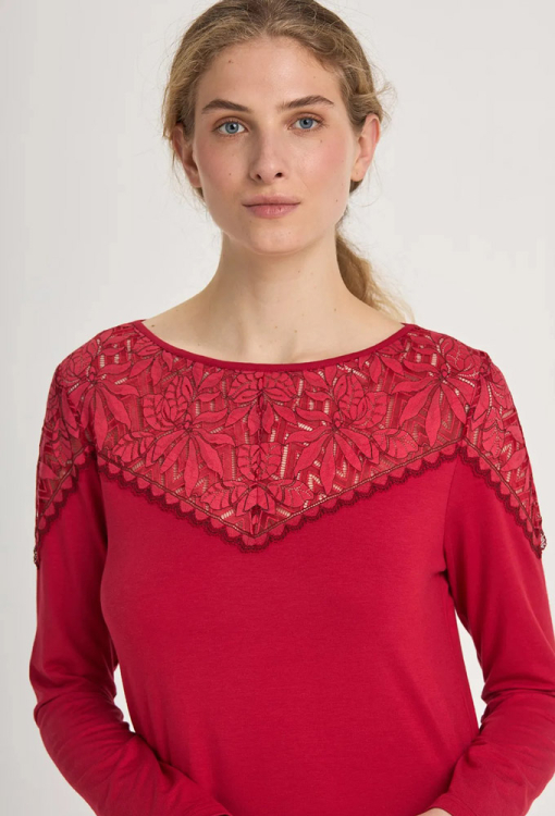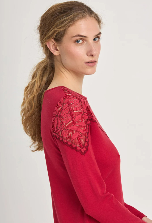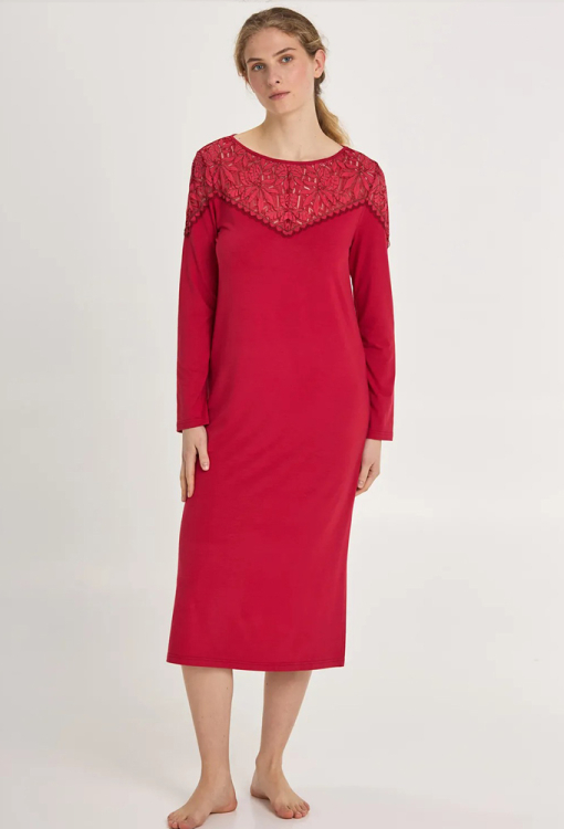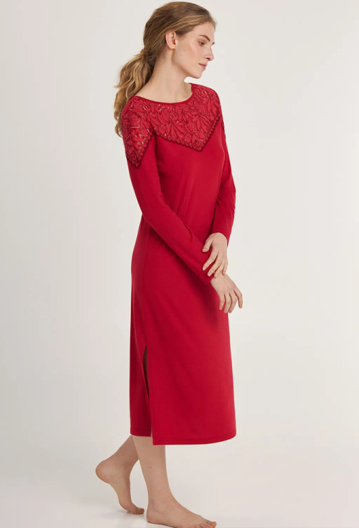 Красива нічна сорочка з колекції Margaret від українського бренду Ellen. Сорочка виконана з якісного та м'якого модалу червоного кольору, прямого силуету та довжиною нижче колін. Модель з довгими рукавами, круглим вирізом горла та високими розрізами з боків, угорі прикрашена широкими вставками з ажурного мережива. Нічна сорочка елегантна і дуже комфортна, ідеальна для сну і домашнього відпочинку, також може бути чудовим подарунком коханій або близькій людині.