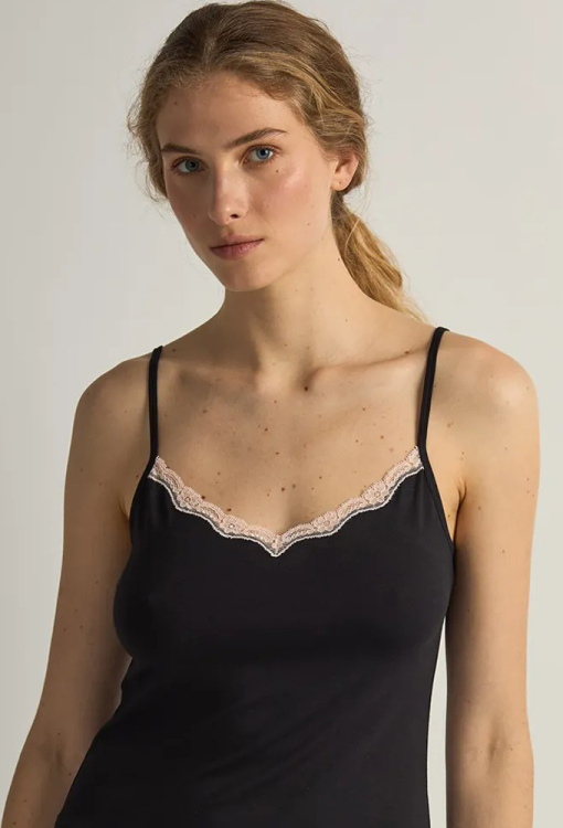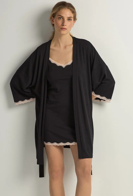 Приваблива нічна сорочка з колекції Vivi від українського бренду Ellen. Сорочка виконана з якісного та м'якого модалу чорного кольору, прилеглого силуету та довжиною міні. Модель із тонкими регульованими бретелями та V-подібним декольте, внизу з боків оброблена невеликими бічними розрізами. Лінія декольте, низ та розрізи виробу прикрашені вставками із тонкого ажурного мережива білого кольору. Нічна сорочка дуже гарна і приємна до тіла, ідеальна для сну і домашнього відпочинку, також може бути чудовим подарунком коханій або близькій людині.