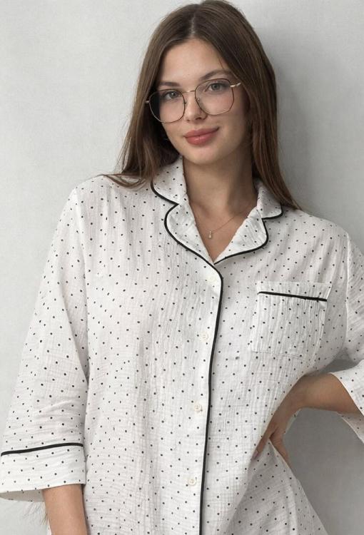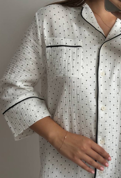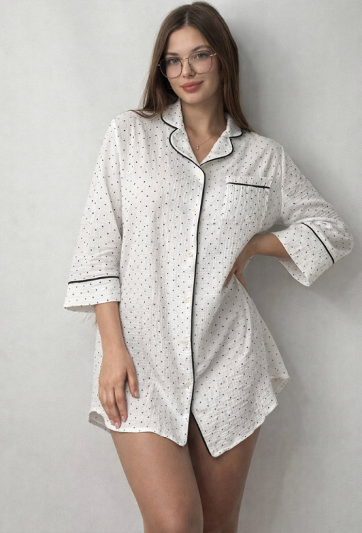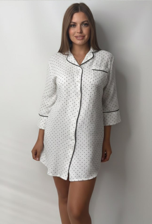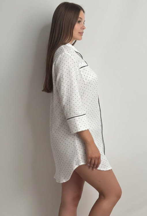 Приваблива нічна сорочка від українського бренду V.Velika. Сорочка виконана з м'якого та якісного мусліну, білого кольору в дрібний горошок чорного відтінку, прямого силуету, із закругленими полицями внизу та довжиною міні. Модель із рукавами 3/4, відкладним коміром та накладною кишенею, застібається на гудзики. Комір, полиці, рукави та кишеня виробу прикрашені тонким кантом чорного кольору. Сорочка дуже красива та комфортна, підкреслить привабливість домашнього образу, також може бути чудовим подарунком для коханої та близької людини.