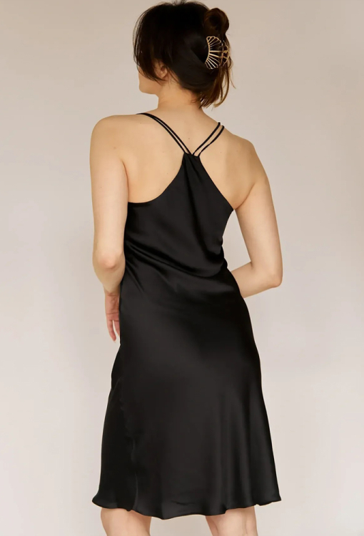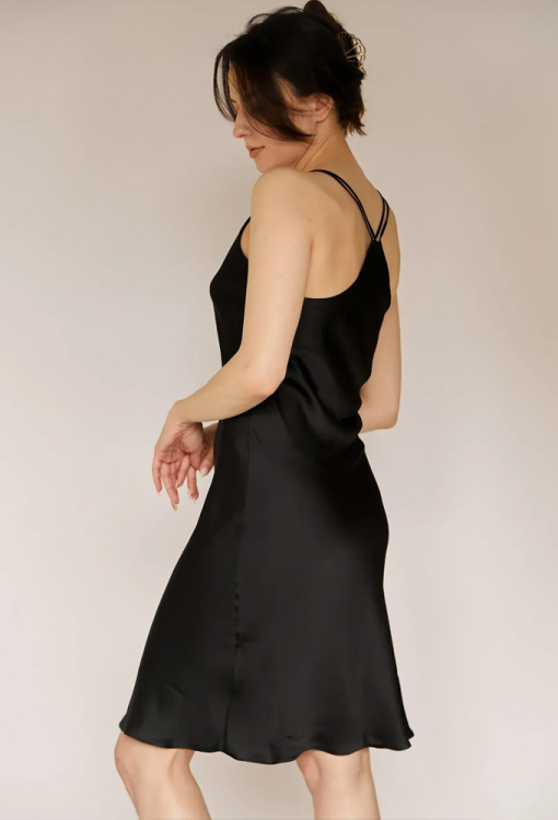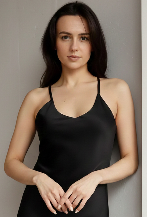 Спокуслива нічна сорочка Anthracite від українського бренду Forly - витончене поєднання елегантності, жіночності та комфорту. Сорочка виконана з якісного і м'якого штучного шовку чорного кольору, напівприлеглого силуету і довжиною вище колін, красиво підкреслює фігуру і створює легкий, повітряний образ. Тонкі подвійні бретелі та U-подібний виріз забезпечують ідеальну посадку та акцентують лінію плечей та зону декольте. Спинка виробу прикрашена оригінальною кокеткою та схрещеними бретелями.Завдяки високій якості матеріалу модель не дає усадку, проста у догляді та зберігає бездоганний зовнішній вигляд навіть після багаторазового прання. Сорочка неймовірно красива та комфортна, ідеально підійде як для сну, так і для романтичного вечора вдома, а також стане чудовим подарунком коханій чи близькій людині.