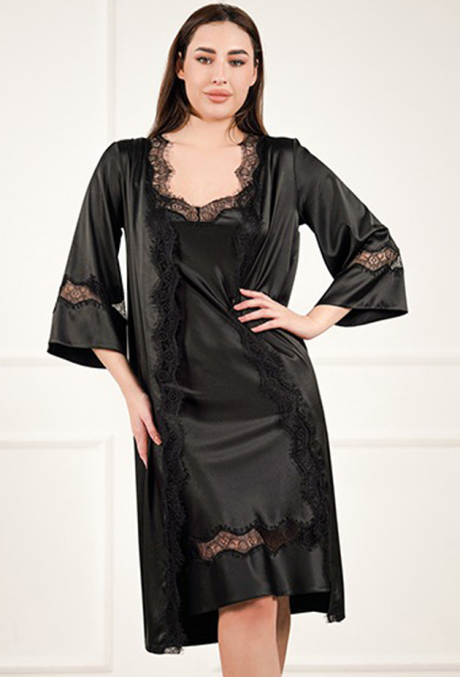 Витончена нічна сорочка з колекції Diamond від українського бренду Komilfo. Сорочка виконана з м'якого та якісного шовк-сатину чорного кольору, напівприлеглого силуету та довжиною трохи вище колін. Модель на тонких бретелях, що регулюються, з V-подібним декольте, прикрашена тонкими мереживними вставками по лінії вирізу, вгорі на спинці та внизу. Нічна сорочка дуже гарна і комфортна, підкреслить привабливість жіночого образу, упакована у фірмову коробку, підійде для подарунка коханій жінці або дівчині!