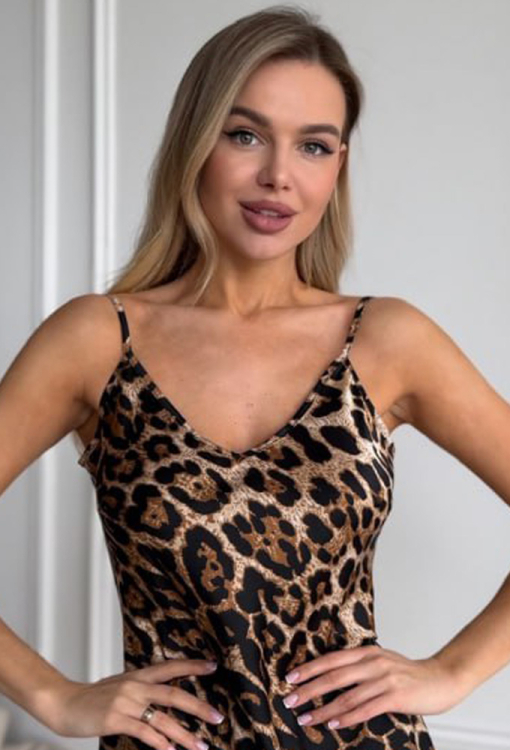 Сексуальна жіноча нічна сорочка від українського бренду Julia Ulich. Сорочка виконана з м'якого та якісного шовк-сатину, бежевого кольору у великий леопардовий принт чорного кольору, напівприлеглого силуету та довжиною вище колін. Модель на тонких бретелях, що регулюються, з V-подібним декольте і таким же вирізом на спині, внизу прикрашена хвилястим швом. Нічна сорочка красива і дуже комфортна, зробить домашні вечори особливими та романтичними, також може бути прекрасним подарунком коханій та близькій людині!