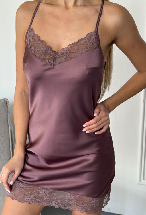 Красива жіноча нічна сорочка від українського бренду Julia Ulich. Сорочка виконана з м'якого та якісного шовк-сатину шоколадного кольору, напівприлеглого силуету та довжиною вище колін. Модель на тонких регульованих бретелях, з V-подібним декольте та ефектною мереживною спинкою, по лінії декольте та внизу прикрашена вставками з ажурного мережива. Нічна сорочка розкішна і дуже комфортна, ідеальна для приємного сну і неперевершеного домашнього образу, також може бути прекрасним подарунком коханій і близькій людині!