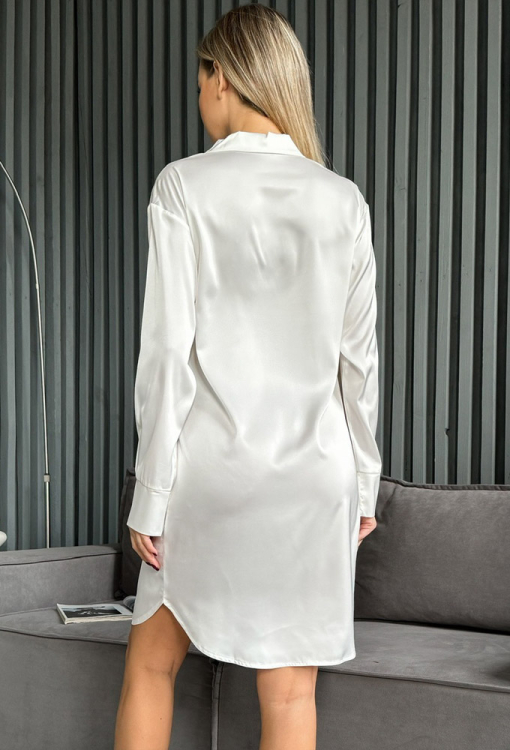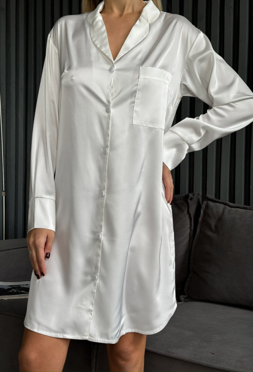 Легка та приємна до тіла жіноча нічна сорочка від українського бренду Julia Ulich. Сорочка виконана з м'якого та якісного шовк-сатину кремового кольору, прямого силуету та довжиною вище колін. Модель з довгими рукавами та відкладним коміром, застібається на ґудзики. На грудях ліворуч виріб прикрашений накладною кишенькою, рукави оброблені вільними манжетами, полиці внизу закруглені. Сорочка красива і дуже комфортна, ідеальна для створення стильного домашнього образу, також може бути чудовим подарунком коханій та близькій людині!