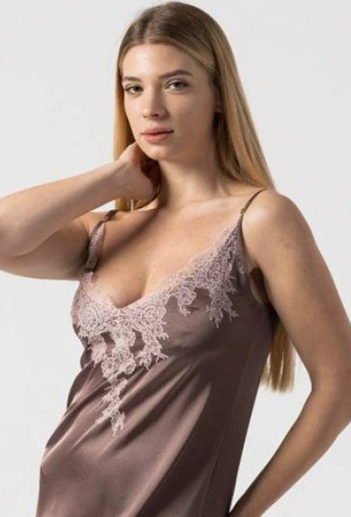 Ефектна жіноча нічна сорочка із колекції Mocca від українського бренду Felena. Сорочка виконана з м'якого та якісного віскозного шовку кольору мокко, напівприлеглого силуету та довжиною нижче колін. Модель на тонких бретелях, що регулюються і з V-подібним декольте внизу зліва оброблена високим розрізом, на спинці - глибоким круглим вирізом. Ліф, низ та розріз виробу прикрашені фігурними вставками з ажурного мережива у поєднанні з аплікаціями кремового кольору. Нічна сорочка дуже гарна і комфортна, надасть розкішності жіночому образу, а також може бути прекрасним подарунком коханій і близькій людині.