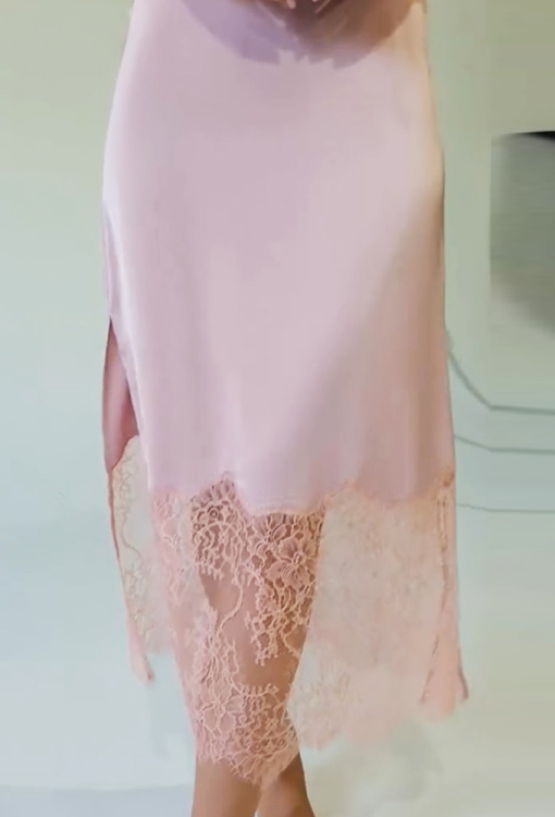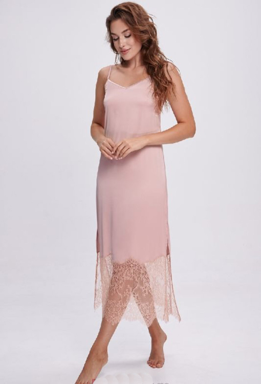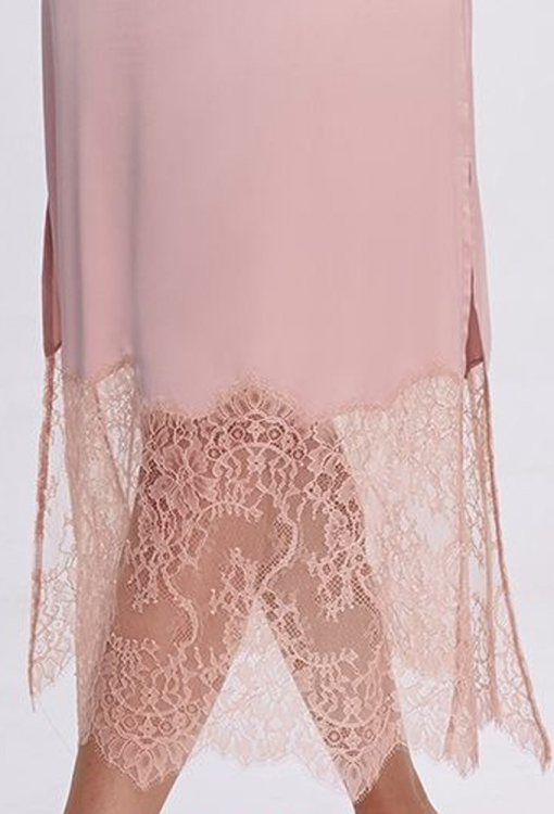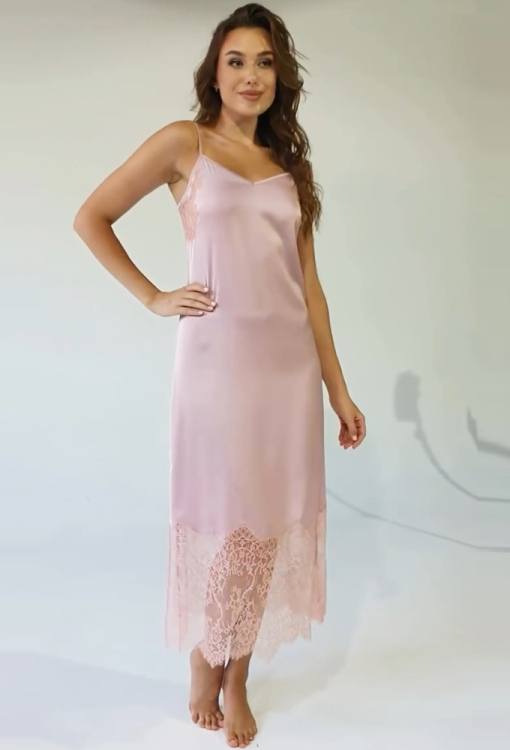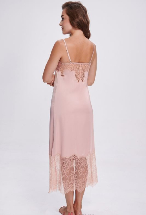 Елегантна нічна сорочка від українського бренду Shato. Сорочка виконана з якісного та м'якого шовку Армані пудрового кольору, напівприлеглого силуету та довжиною нижче колін. Модель на тонких регульованих бретелях, з V-подібним декольте та високими бічними розрізами, на спинці прикрашена вирізними вставками з ажурного мережива, низ оброблений широким мереживом. Нічна сорочка дуже гарна і комфортна, також буде відмінним подарунком для коханої або близької людини.