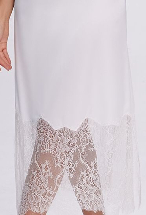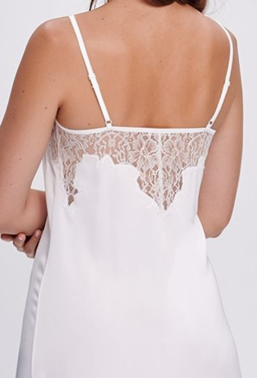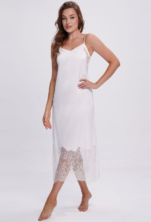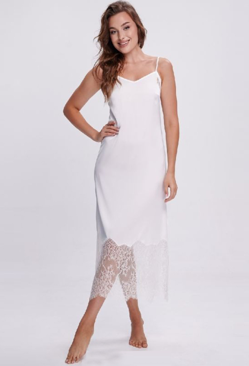 Елегантна нічна сорочка від українського бренду Shato. Сорочка виконана з якісного та м'якого шовку Армані кремового кольору, напівприлеглого силуету та довжиною нижче колін. Модель на тонких регульованих бретелях, з V-подібним декольте та високими бічними розрізами, на спинці прикрашена вирізними вставками з ажурного мережива, низ оброблений широким мереживом. Нічна сорочка дуже гарна і комфортна, також буде відмінним подарунком для коханої або близької людини.