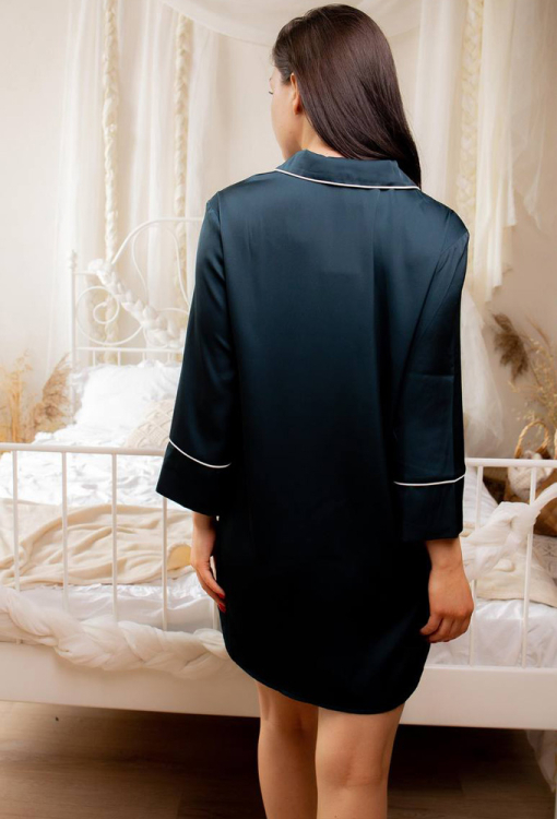 Класична нічна сорочка від українського бренду V.Velika. Сорочка виконана з м'якого та якісного шовку Армані смарагдового кольору, вільного силуету, довжиною міні та із закругленими полицями внизу. Модель із рукавами 3/4, відкладним коміром та накладною кишенею, застібається на ґудзики. Комір, полиці, рукави та кишеня виробу прикрашені тонким кантом білого кольору. Сорочка дуже красива та комфортна, підійде як для сну, так і для домашнього відпочинку, також може бути чудовим подарунком для коханої та близької людини.