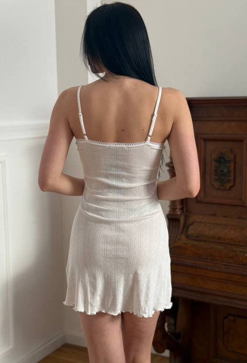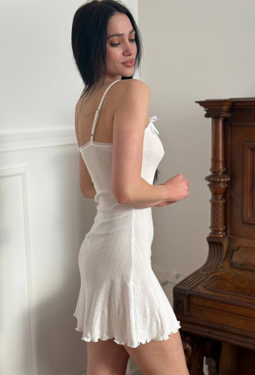 Спокуслива нічна сорочка від українського бренду V.Velika. Сорочка виконана з м'якого та якісного бавовняного трикотажу з ажурною фактурою у вигляді смужок та ромбів молочного кольору, прилеглого силуету та довжиною міні. Модель із тонкими регульованими бретелями та круглим декольте, по лінії вирізу прикрашена тонким мереживом білого кольору та на бретелях – білими атласними бантиками. Внизу виріб оброблений декоративним хвилястим швом. Нічна сорочка дуже легка і приємна до тіла, підкреслить сексуальність домашнього образу, також може бути чудовим подарунком для коханої та близької людини.