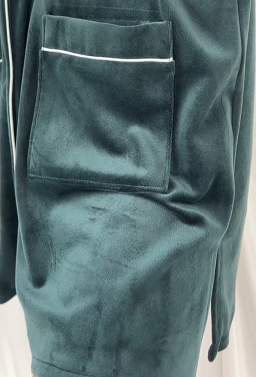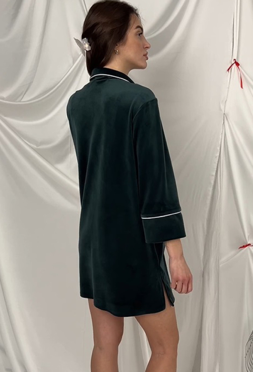 Коротка нічна сорочка від українського бренду V.Velika. Сорочка виконана з м'якого та якісного велюру смарагдового кольору, вільного силуету та довжиною міні. Модель з рукавами 3/4, відкладним коміром та двома накладними кишенями, застібається на ґудзики. Комір, полиці, рукави та кишені сорчки прикрашені тонким кантом білого кольору, внизу з боків виріб оброблено невеликими розрізами. Сорочка дуже красива та комфортна, підкреслить привабливість домашнього образу, також може бути чудовим подарунком для коханої та близької людини.