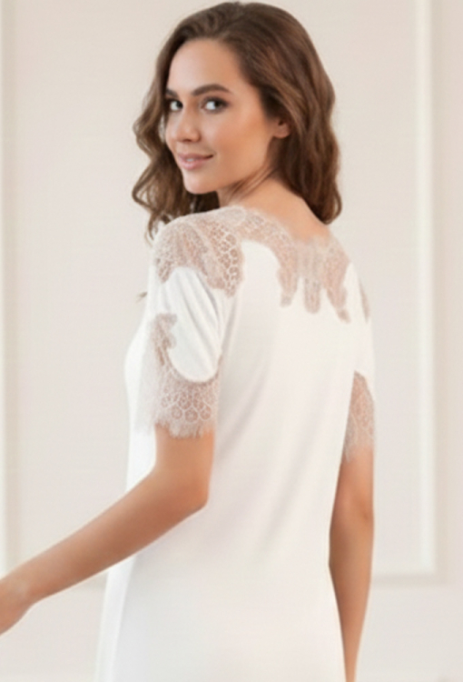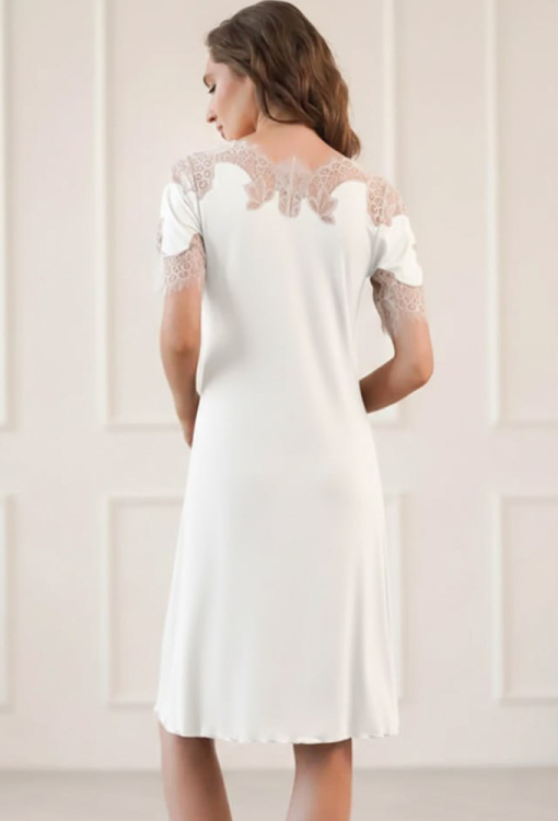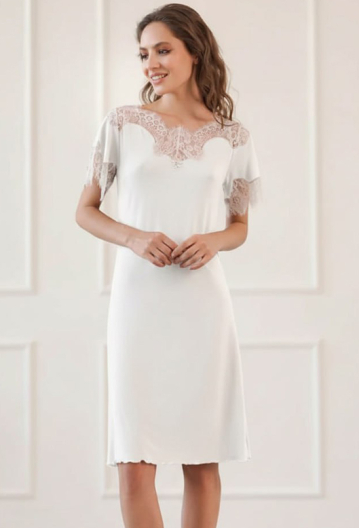 Класична жіноча нічна сорочка Miranda від українського бренду Komilfo - поєднання жіночності, комфорту та елегантного домашнього стилю. Нічна сорочка виконана з м'якої, якісної та приємної до тіла віскози кремового кольору, має напівприлеглий силует, короткі рукави й довжину трохи вище колін, красиво підкреслюючи фігуру. Акуратний виріз горла ефектно прикрашений фігурними вставками з ажурного мережива, які продовжуються на плечах та спинці, створюючи завершений образ. Рукави також оброблені мереживом, додаючи виробу ніжності. Нічна сорочка неймовірно красива і комфортна, підкреслює витонченість жіночного образу, а фірмова упаковка робить її чудовим подарунком для коханих і близьких людей.