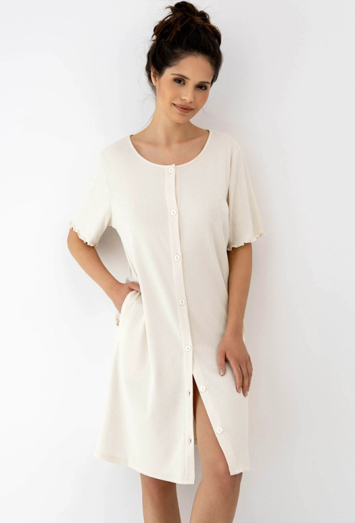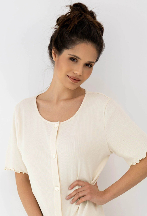Елегантна нічна сорочка Bayla від польського бренду Sensis. Сорочка виконана з якісної та м'якої віскози в рубчик кремового кольору, прямого силуету та довжиною вище колін. Модель з короткими рукавами та круглим вирізом горла, застібається на ґудзики. З боків виробу розташовані зручні кишені, рукави оброблені декоративним хвилястим швом. Сорочка дуже красива і комфортна, також буде зручним одягом для дому або чудовим подарунком коханій та близькій людині!