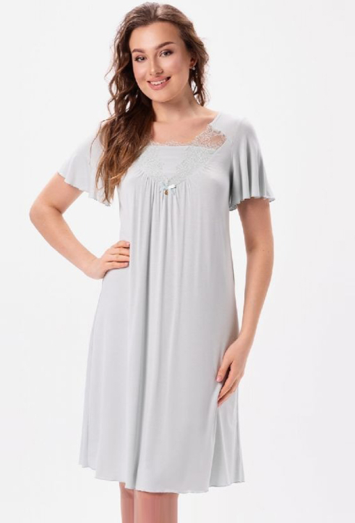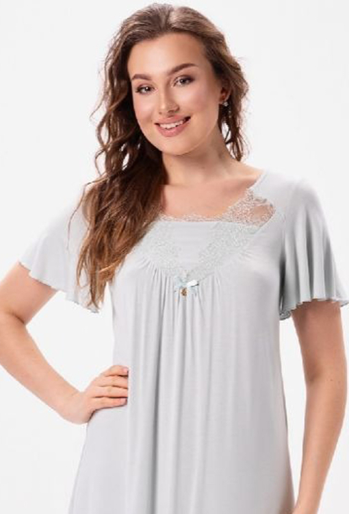 Чарівна нічна сорочка від українського бренду Shato. Сорочка виконана з якісної та м'якої віскози світло-блакитного кольору, вільного силуету та довжиною трохи вище колін. Модель з короткими розкльошеними рукавами, круглим вирізом горла та ліфом оригінального крою у вигляді кокетки та м'яких складок. Виріз виробу прикрашений широкими вставками з ажурного мережива та атласним бантиком із підвіскою, рукави та низ оброблені декоративним хвилястим швом. Нічна сорочка дуже гарна і комфортна, також може бути чудовим подарунком для близьких людей!
