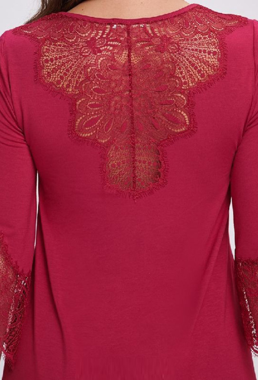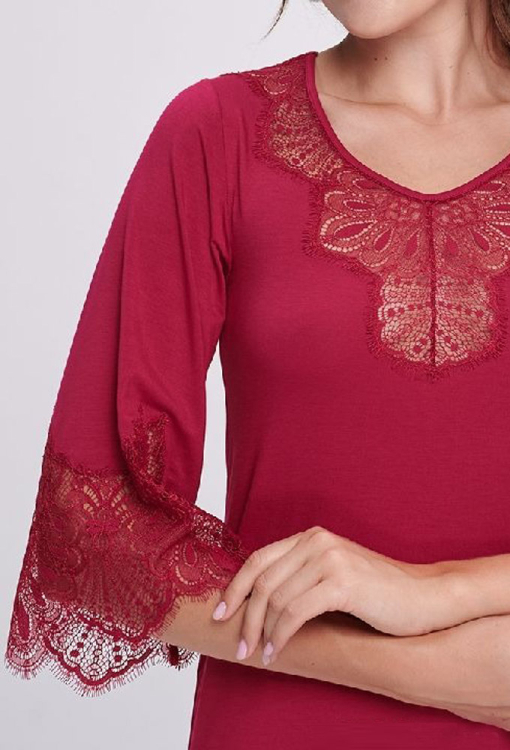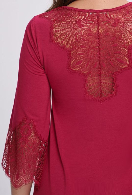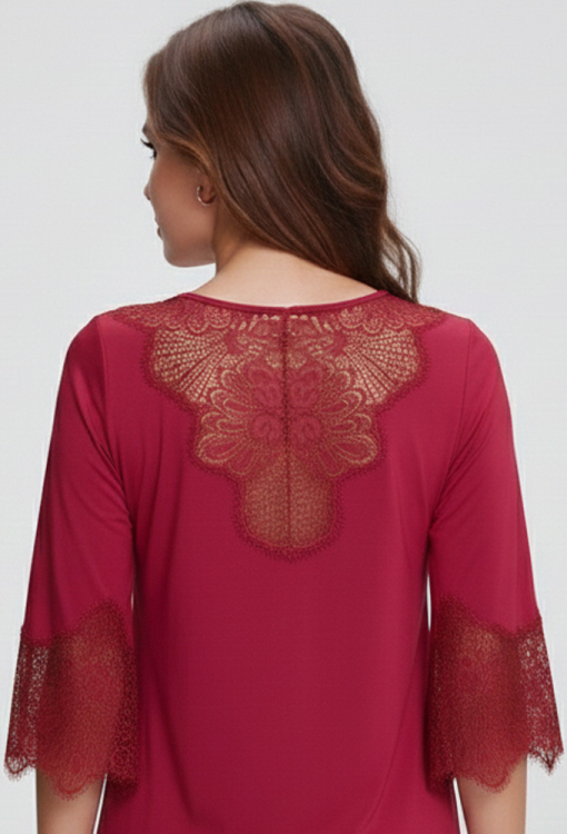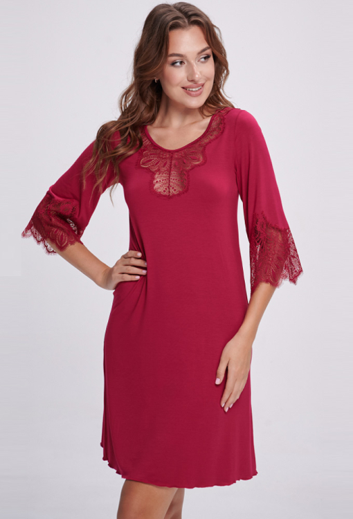 Класична нічна сорочка від українського бренду Shato - елегантне поєднання жіночності, витонченого стилю та комфорту. Сорочка виконана з якісної та м'якої віскози бордового кольору, напівприлеглого крою і довжиною вище колін - красиво підкреслює фігуру. Злегка розширені рукави 3/4, акуратний U-подібний виріз та декоративний хвилястий шов по низу моделі створюють гармонійний та витончений силует. Виріз, рукави та спинка ефектно прикрашені фігурними вставками з ніжного мережива з витонченими «віями», які надають образу особливий шарм та романтичність. Нічна сорочка неймовірно красива і комфортна, стане чудовим подарунком для коханої або близької людини.