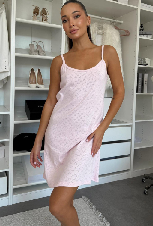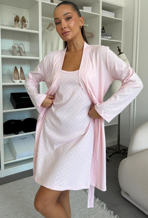 Комфортний жіночий комплект нічна сорочка з халатом від українського бренду Cosy. Комплект виконаний з якісної та м'якої бавовни рожевого кольору з ажурною фактурою у вигляді сердець, складається з сорочки прямого силуету та халата з довгими рукавами. Нічна сорочка на тонких регульованих бретелях і з V-подібним вирізом горла, довжина вище колін. Халат вільного крою довжиною вище колін, зав'язується на запах за допомогою пояса. Комплект дуже легкий і приємний до тіла, упакований у фірмову коробку, також може бути чудовим подарунком коханій та близькій людині.