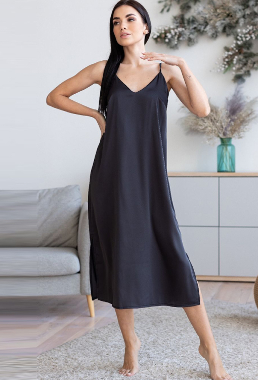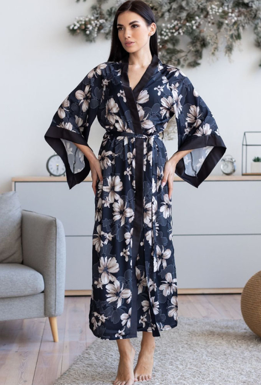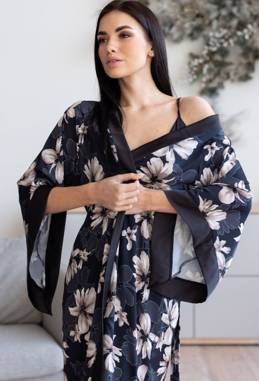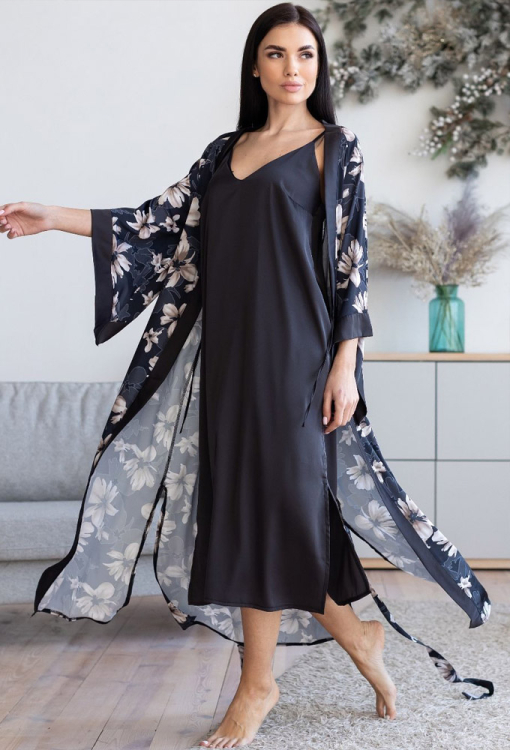 Розкішний комплект нічна сорочка з халатом від українського бренду MiaNaGreen. Комплект виконаний з м'якого та якісного штучного шовку графітового кольору, складається з однотонної сорочки та халату з принтом у вигляді великих бежевих квітів. Нічна сорочка вільного силуету, на тонких бретелях, що регулюються, і довжиною нижче колін, внизу оброблена бічними розрізами. Халат з широкими рукавами 7/8 та довжиною максі, зав'язується на запах за допомогою пояса. Борти та рукави виробу прикрашені однотонними вставками графітового кольору, з боків високі розрізаи. Комплект дуже гарний та комфортний, ідеальний для домашнього користування, упакований у фірмову коробку, стане чудовим варіантом для подарунка коханій та близькій людині!