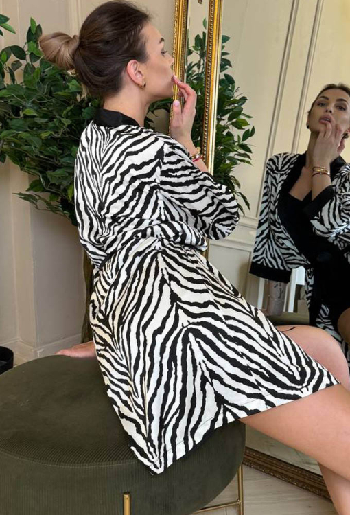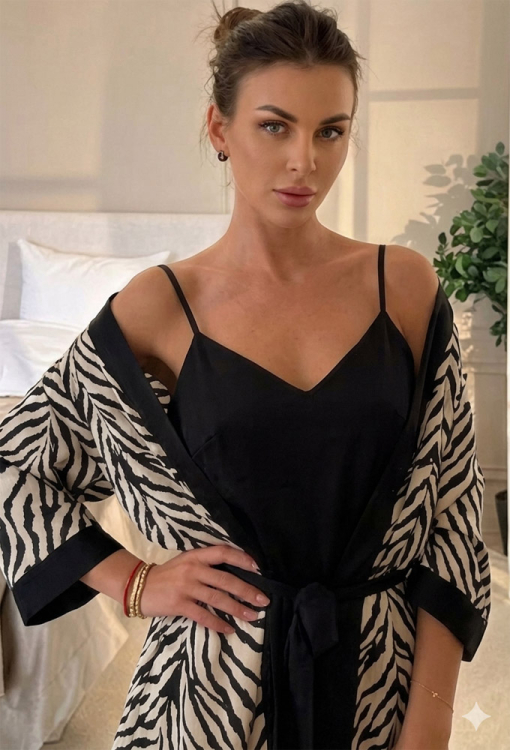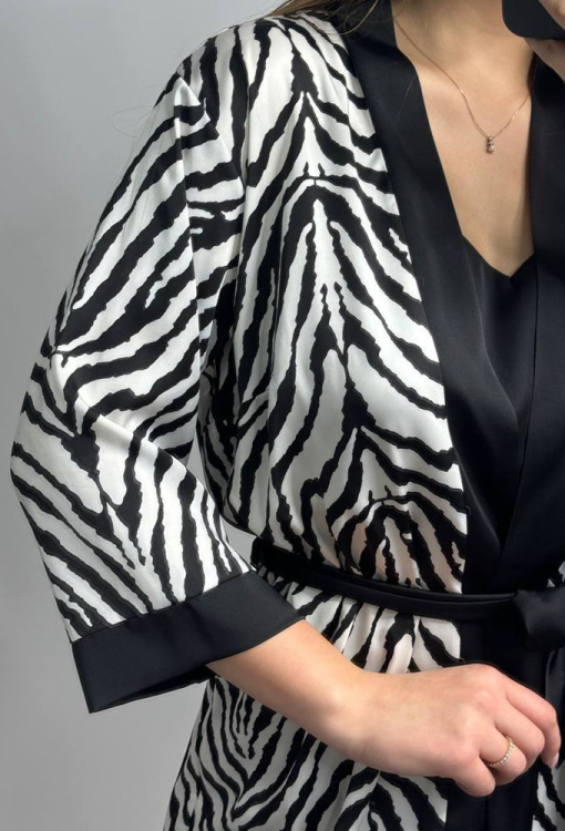 Стильний комплект нічна сорочка з халатом від українського бренду V.Velika. Комплект виконаний з м'якого та якісного шовку Армані, складається з сорочки чорного кольору та халату у чорно-білий принт зебра. Нічна сорочка напівприлеглого силуету, довжиною міні, з тонкими регульованими бретелями та V-подібним декольте. Халат вільного крою з рукавами 3/4 й довжиною вище колін, прикрашений вставками з однотонного шовку чорного кольору на бортах і рукавах, пояс виконаний в тон обробки. Комплект дуже гарний та приємний до тіла, ідеальний для сну та домашнього відпочинку, також може бути чудовим подарунком для коханої та близької людини.