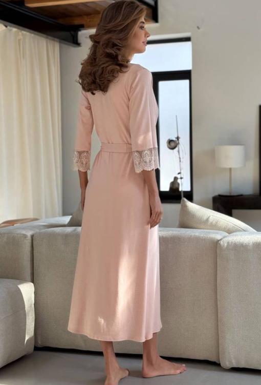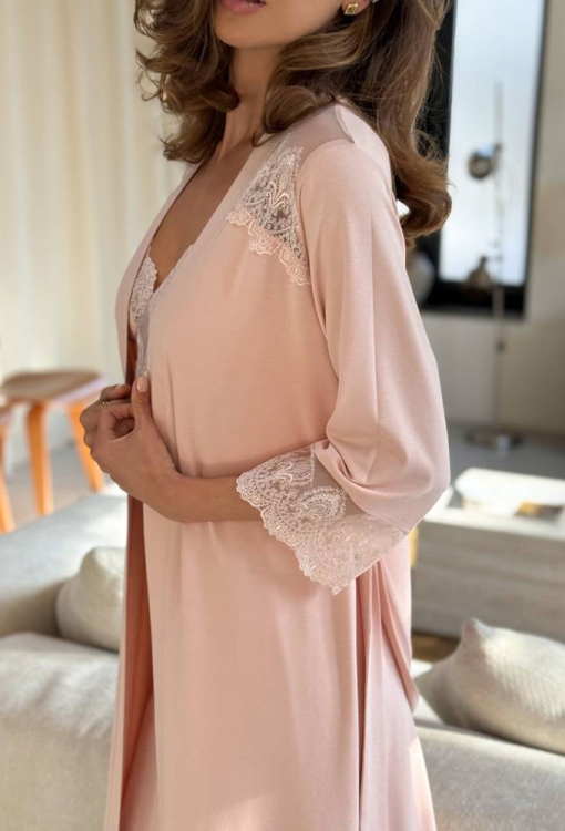 Шикарний жіночий комплект нічна сорочка з халатом від українського бренду Violet delux. Комплект виконаний з м'якої та якісної віскози пудрового кольору, складається з сорочки напівприлеглого силуету та халату вільного крою. Нічна сорочка з тонкими регульованими бретелями, глибоким V-подібним декольте і довжиною нижче колін. Модель прикрашена розкішним мереживом з вишивкою по лінії декольте та під грудьми та маленьким атласним бантиком по центру вирізу. Халат з рукавами 3/4 та довжиною нижче колін, зав'язується на запах за допомогою пояса. Плечі та рукави виробу прикрашені вставками з мережива з вишивкою. Комплект дуже гарний та комфортний, ідеальний для домашнього користування, також буде чудовим подарунком для близьких людей.