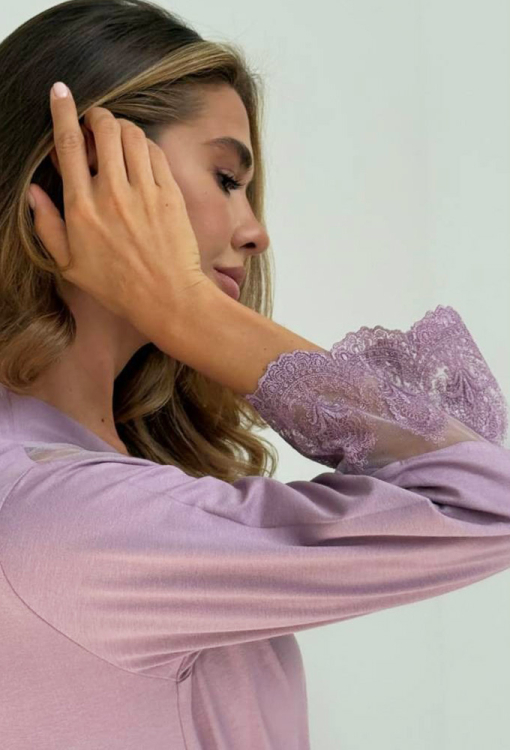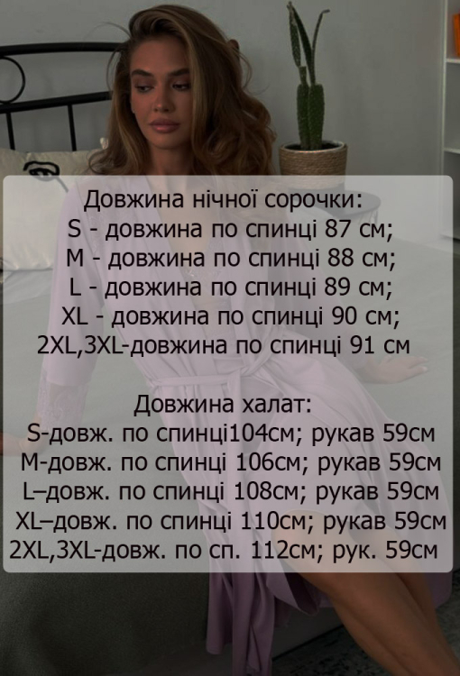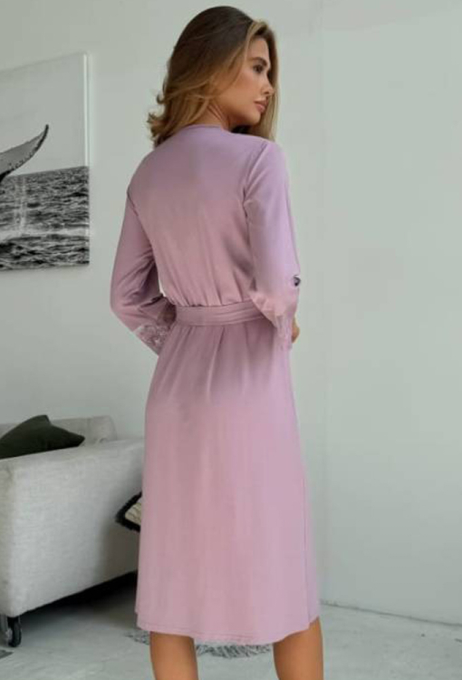 Неперевершений жіночий комплект нічна сорочка з халатом від українського бренду Violet delux. Комплект виконаний з м'якої та якісної віскози бузкового кольору, складається з сорочки напівприлеглого силуету та халату вільного крою. Нічна сорочка з тонкими регульованими бретелями, глибоким V-подібним декольте і довжиною трохи вище колін. Модель прикрашена розкішним мереживом з вишивкою по лінії декольте та під грудьми та маленьким атласним бантиком по центру вирізу. Халат з рукавами 3/4 та довжиною трохи нижче колін, зав'язується на запах за допомогою пояса. Плечі та рукави виробу прикрашені вставками з мережива з вишивкою. Комплект дуже гарний та комфортний, ідеальний для домашнього користування, також буде чудовим подарунком для близьких людей.