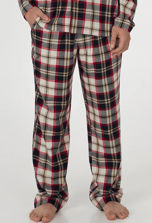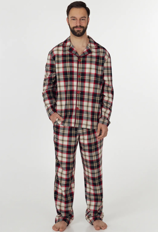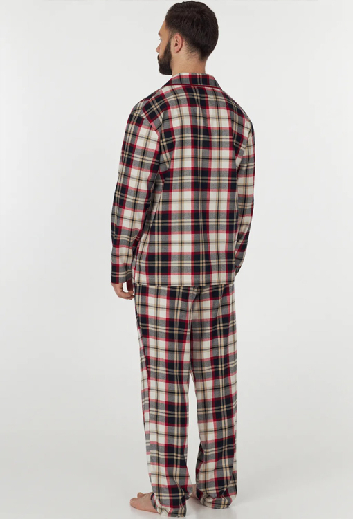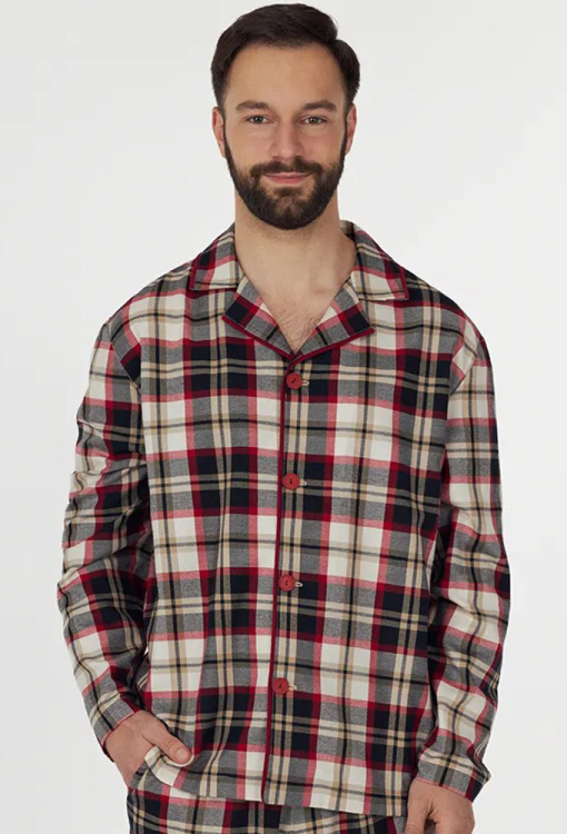 Тепла піжама чоловіча із колекції Meirlot від українського бренду Ellen. Піжама виконана з якісної та м'якої байки, бежевого кольору в синій картатий принт з бордовим акцентом, складається з сорочки зі штанами класичного крою. Сорочка з довгими рукавами та відкладним коміром, застібається на ґудзики, комір та полиці прикрашені тонким кантом бордового кольору. Штани з м'якою гумкою в поясі та зручними бічними кишенями. Піжама дуже красива та комфортна, ідеальна для сну та домашнього відпочинку, а також може бути чудовим подарунком коханій та близькій людині.