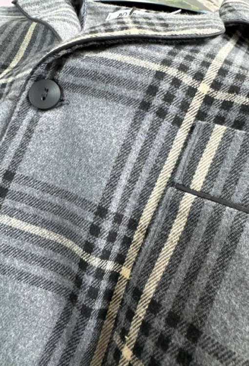 Тепла чоловіча піжама від українського бренду BO.Brand. Піжама виконана з м'якої і якісної фланелі, темно-сірого кольору в чорний картатий принт, складається з сорочки та штанів прямого силуету Сорочка з довгими рукавами, відкладним коміром і накладною кишенею на грудях, застібається ґудзиками. Комір, полиці, рукави та кишеня моделі прикрашені тонким кантом чорного кольору. Штани з м'якою гумкою в поясі та зручними бічними кишенями, внизу оброблені чорним кантом. Піжама дуже красива і приємна до тіла, забезпечить комфорт та бездоганний стиль, а також може бути чудовим подарунком коханій чи близькій людині.