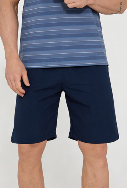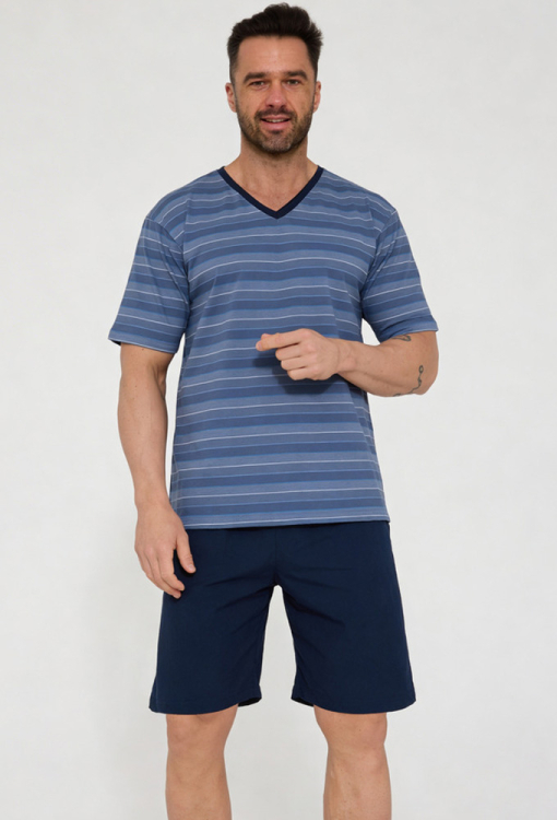 Класична чоловіча піжама від польського бренду Cornette. Піжама виконана з якісної та м'якої бавовни, складається з футболки синього кольору в сірий смугастий принт і темно-синіх шортів. Футболка з короткими рукавами та V-подібним вирізом горла, шорти з м'якою гумкою в поясі. Лінія вирізу футболки прикрашена кантом темно-синього кольору. Піжама дуже красива та комфортна, ідеальна для сну та домашнього відпочинку влітку, упакована в коробку, стане чудовим подарунком близьким людям.