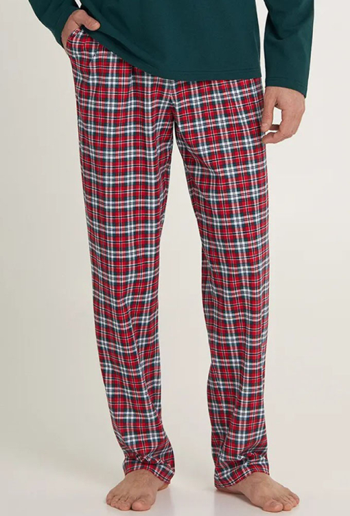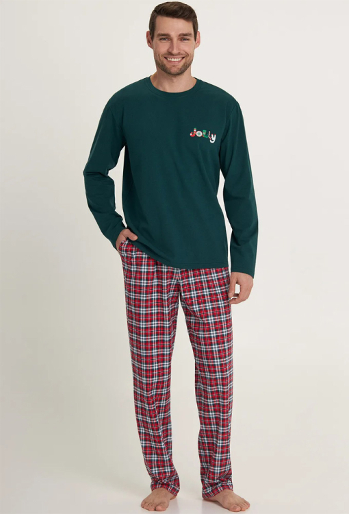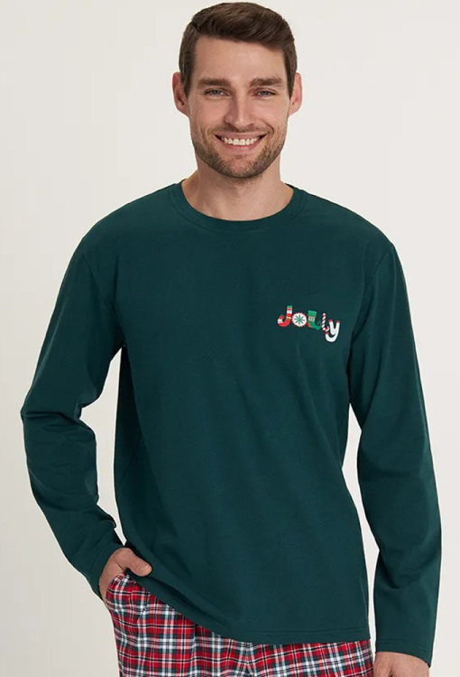 Красива піжама чоловіча Jolly від українського бренду Ellen. Піжама виконана з якісної та м'якої бавовни, складається з кофти зеленого кольору та червоних штанів у білий картатий принт із зеленим акцентом. Кофта прямого силуету, з довгими рукавами та круглим вирізом горла, вгорі зліва прикрашена принтом із напису "Jolly" у різдвяному стилі. Штани також прямого крою, з м'якою гумкою в поясі та зручними бічними кишенями. Піжама стильна і дуже комфортна, ідеальна для сну та домашнього відпочинку, а також може бути чудовим подарунком коханій та близькій людині.