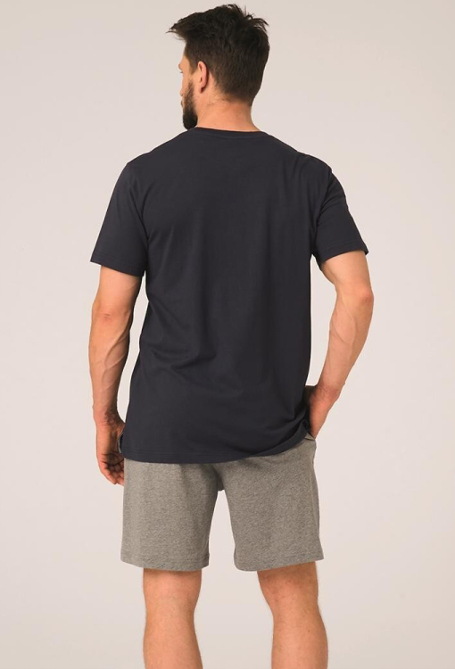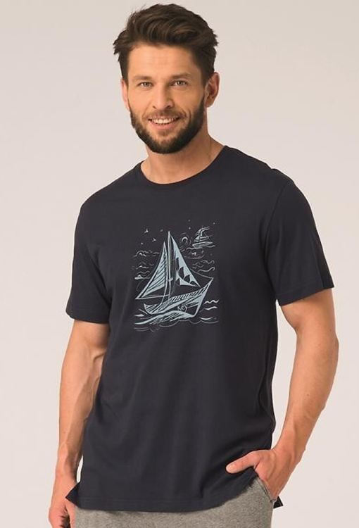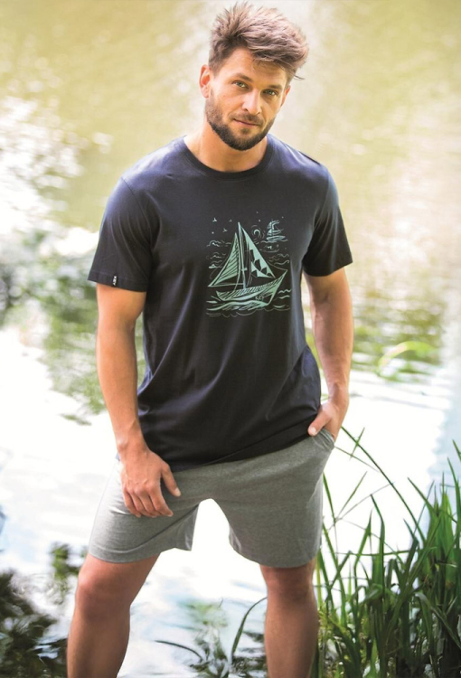 Зручна піжама чоловіча від польського бренду Key. Піжама виконана з якісної та м'якої бавовни, складається з футболки темно-синього кольору та сірих шортів. Футболка прямого крою, з короткими рукавами та круглим вирізом горла, спереду прикрашена великим принтом вітрильника, рукав оброблений бавовняною стрічкою з написом "Key". Шорти з м'якою гумкою в поясі та зручними бічними кишенями. Піжама красива і дуже комфортна, ідеальна для дому та подорожей, а також може бути чудовим подарунком коханій або близькій людині.