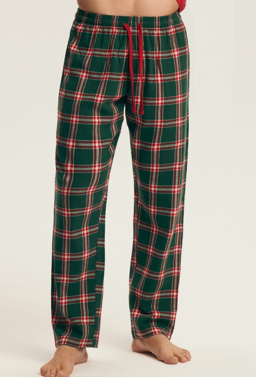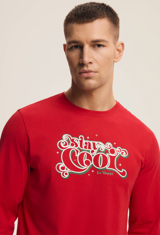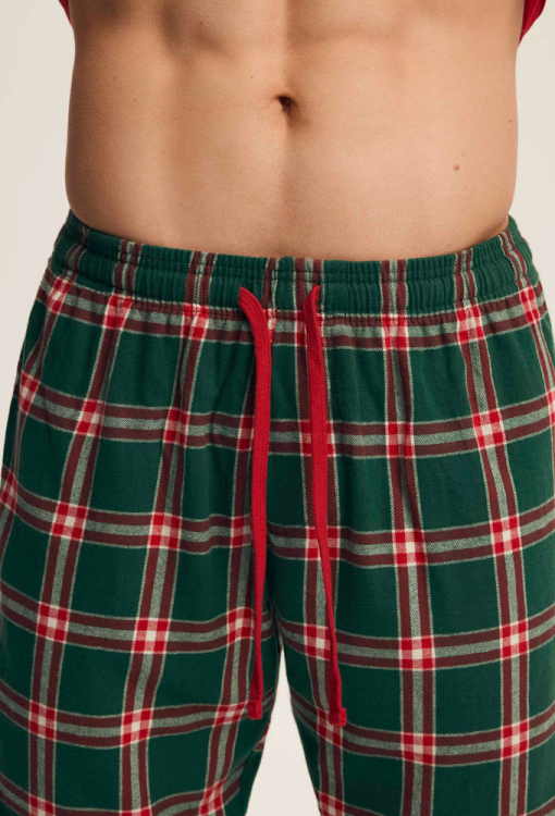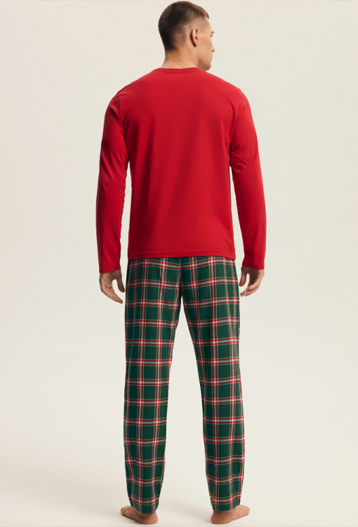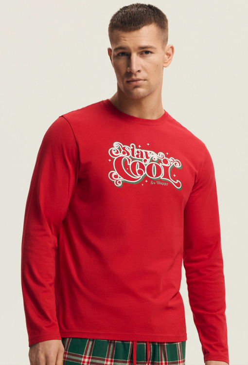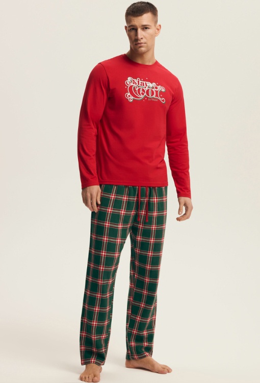 Новорічна піжама чоловіча Nougat від польського бренду Henderson. Піжама виконана з м'якої та якісної бавовни, складається з кофти червоного кольору та зелених штанів у червоний картатий принт. Кофта вільного крою з довгими рукавами та круглим вирізом горла, прикрашена різдвяним принтом з написом “Stay Cool”. Штани прямого крою та з м'якою гумкою на поясі, регулюються по ширині внутрішнім шнурком червоного кольору, забезпечуючи ідеальну посадку. Піжама красива та приємна до тіла, ідеальна для зимових вечорів та свят, упакована у фірмову коробку, стане чудовим подарунком близьким людям!